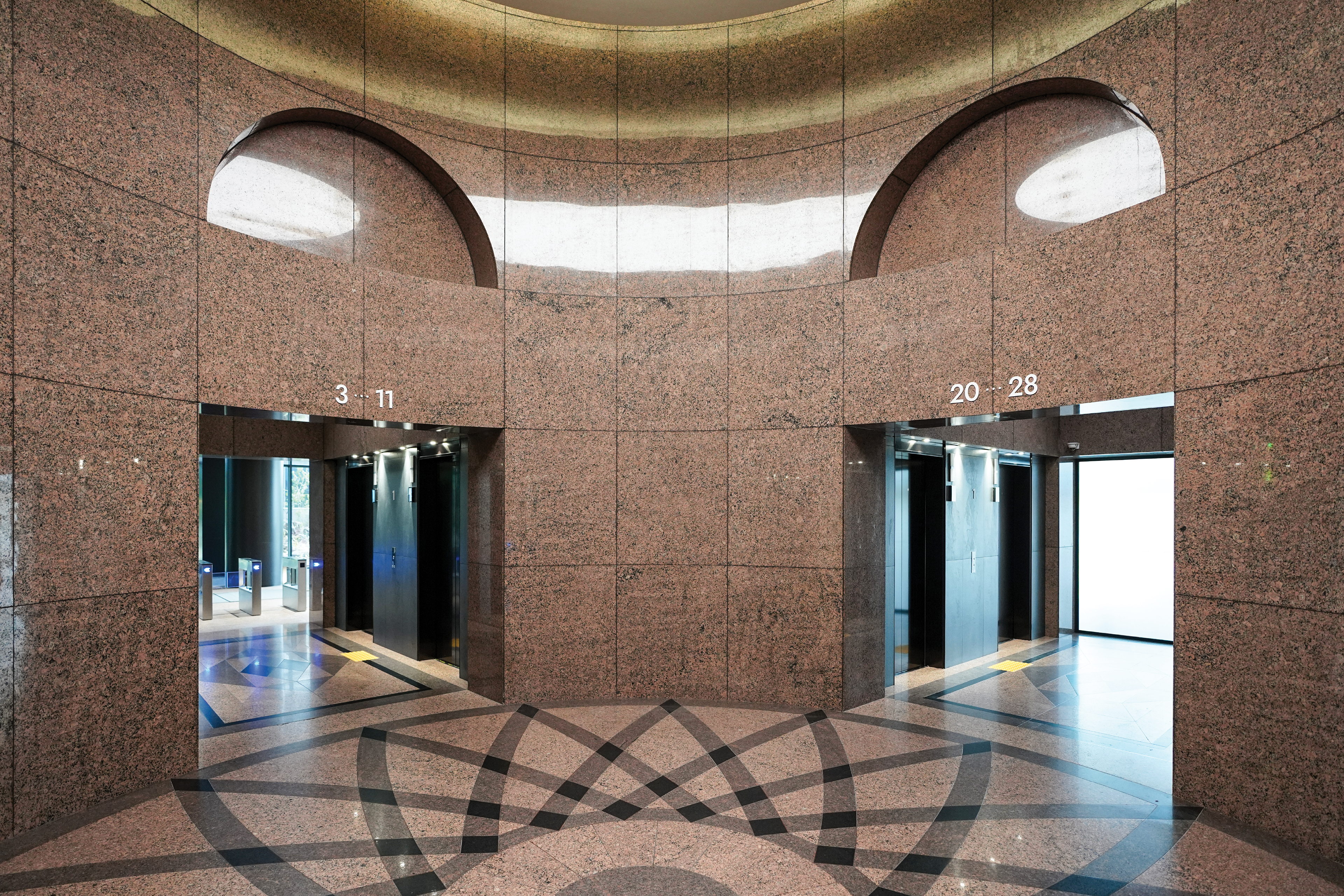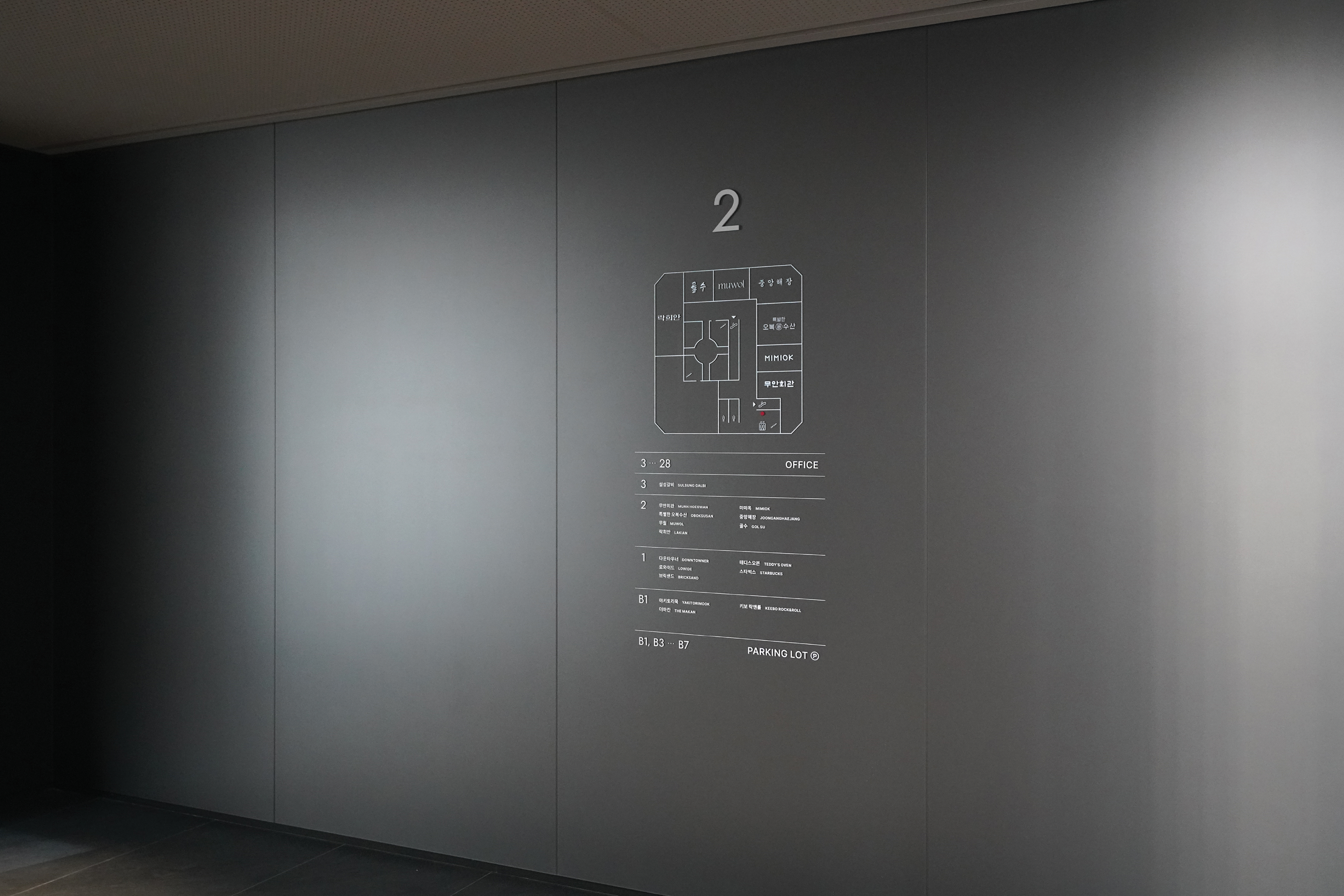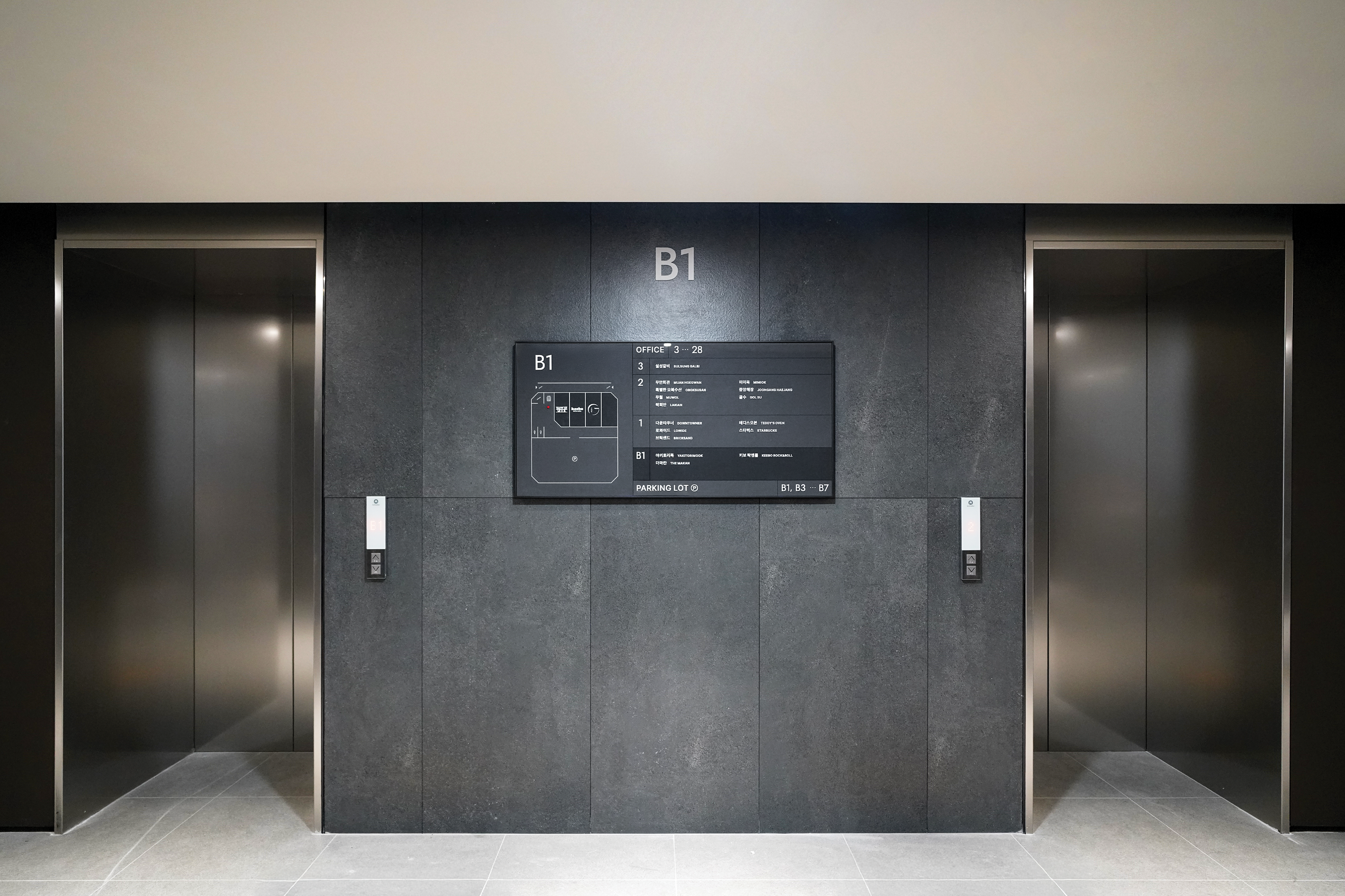 TOBE는 입주사 교체가 잦은 빌딩의 특성을 고려해, 교체와 관리가 용이하도록 주요 사이니지에 모듈형 구조를 도입하고, 운영 효율성을 높이는 시스템을 설계했습니다. 디자인은 인테리어의 진중하고 신뢰감 있는 분위기를 반영해 절제된 현대적 미감으로 구성하였으며, 새로운 B.I에서 파생된 그래픽 모티프를 적용해 공간 전반의 시각적 통일성과 정체성을 강화했습니다.