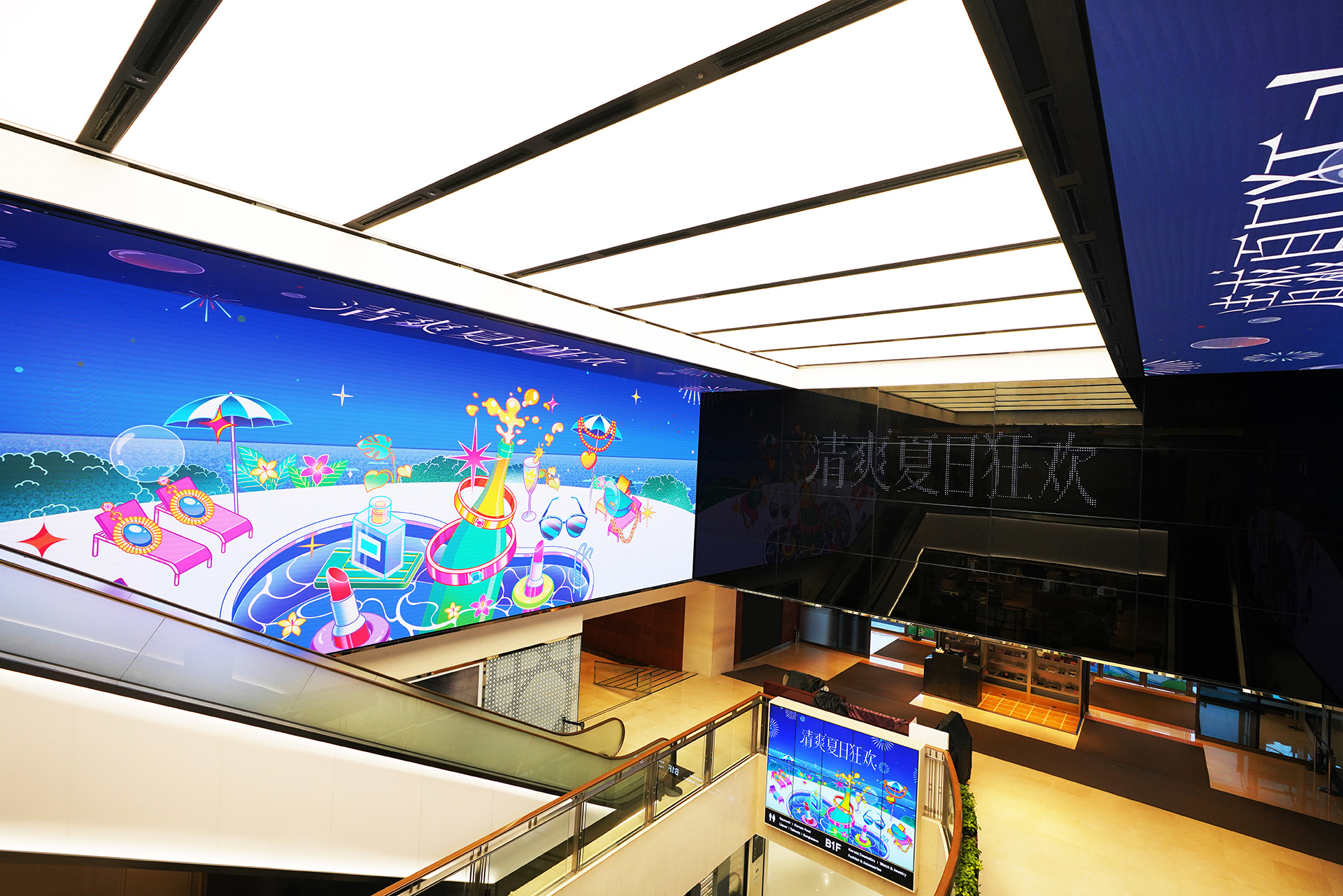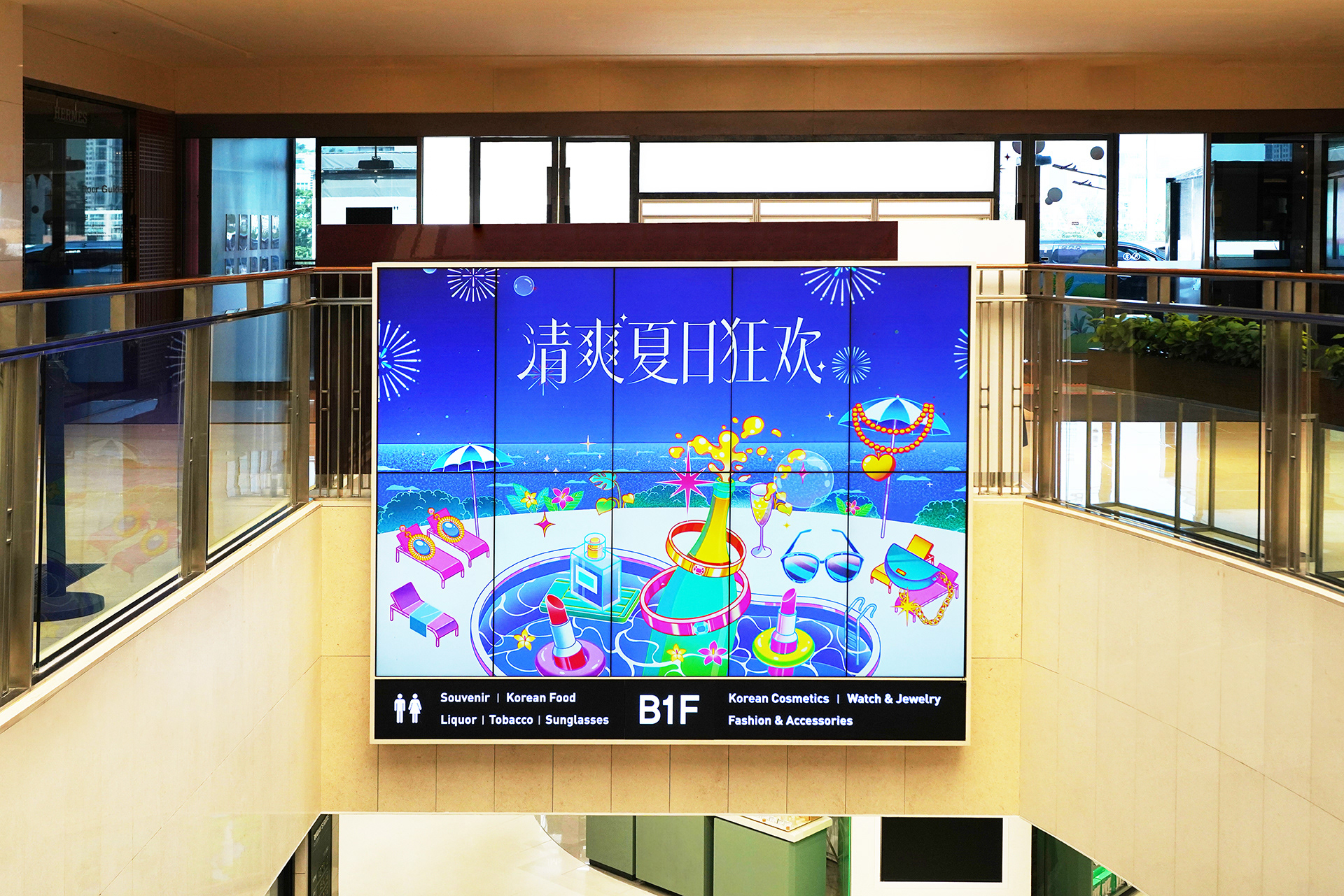 팡 터지는 샴페인을 중심으로 여름에 어울리는 면세점 상품들을 재치있게 의인화한 일러스트레이션을 면세점 내 다양한 매체에 반영하여 시원하고 반짝이는 여름 축제의 무드를 전달했습니다.